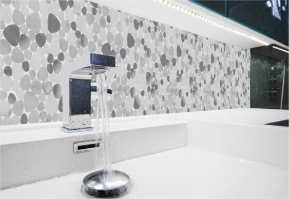 - Randomly sized pebble-shaped tiles to add an exciting aesthetic touch to bathroom, spa, kitchen or pool trim